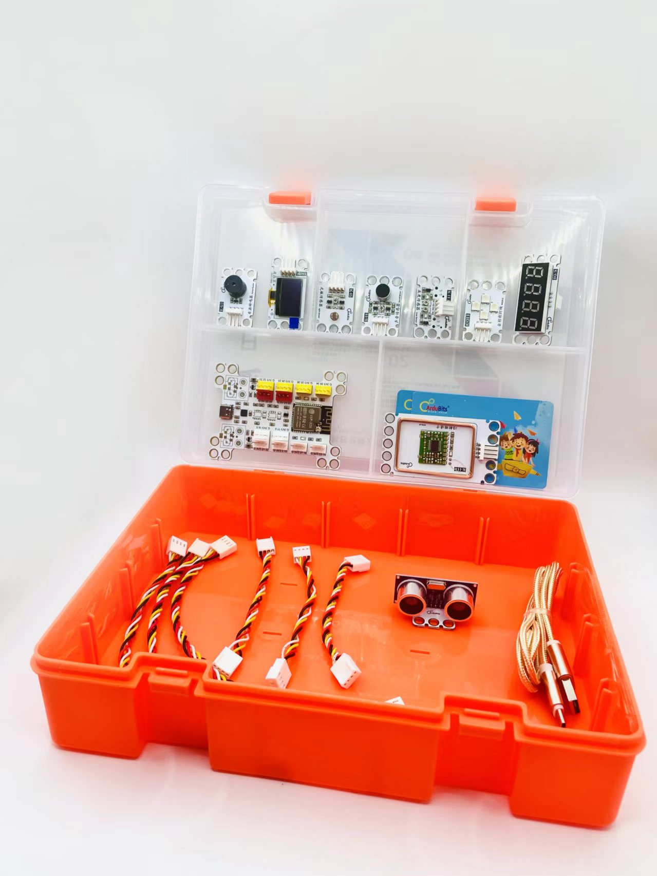 Mixgo-max主控详细:处理器:ESP32芯片主频:高达240MHz的时钟频率;SRAM:520KB;Flash:4MB;Wi-Fi标准:FCC/CE/TELEC/KCC;Wi-Fi协议:802.11 b/g/n/d/e/i/k/r (802.11n,速度高达150 Mbps),A-MPDU和A-MSDU聚合,支持0.4us防护间隔;频率范围:2.4~2.5 GHz;蓝牙协议:符合蓝牙v4.2 BR/EDR和BLE标准;接口:5v供电 ,type-c接口下载程序 ,端口采用4pin连接线,2510防反接接线座,3.3V和5V端口输出, 除了GPIO34 35 36 39 只能作为输入外,支持pwm输出,模拟输入,数字输出,i2c通信,串口通信,支持20路IO口输入输出。结构特点:结构兼容乐高积木和椴木板,可直接连接乐高积木或者椴木板完成跟多创意。软件:支持米思齐、arduino、mind+等编程软件。套件包含模块:MIXGO MAX 编程板1;ID射频读卡1;光敏传感器1;声音传感器1;OLED显示屏1;有源蜂鸣器1;超声波传感器1;灰度传感器1;四位数码管1;全彩灯块1;杜邦线6;数据线1;ID卡2。