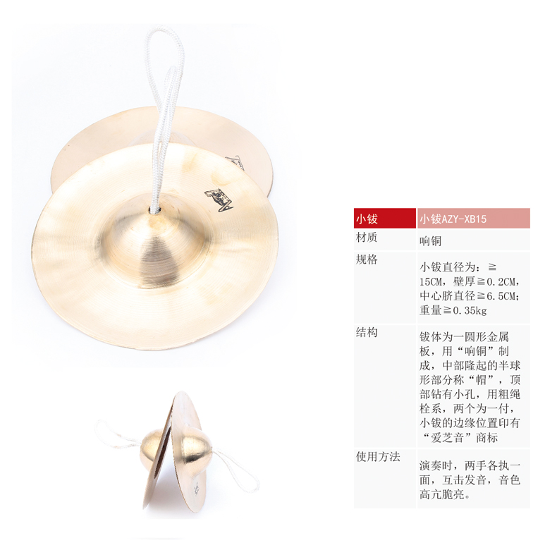 1、材质:响铜2、规格:直径≧15CM,壁厚≧0.2CM3、结构:钹体为一圆形金属板,用“响铜”制成,中部隆起的半球形部分称“帽”,顶部钻有小孔,用粗绳栓系,两个为一付